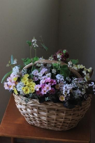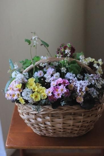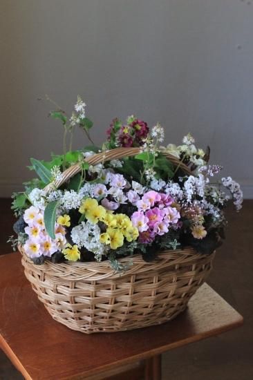 優しい花色が魅力、松原園芸さんのプリムラ・ジェシカとふっさふさに咲いたハーデンベルギアのブリコラージュフラワーです。