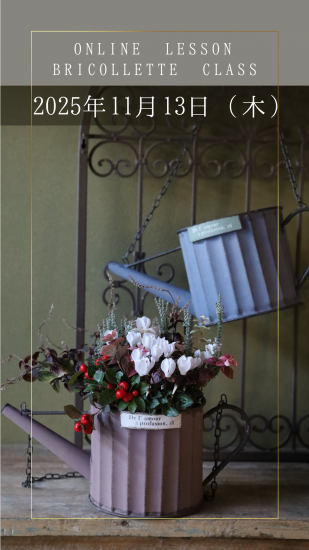 ブリキジョーロにガーデンシクラメン・ホワイトをメイン花材にしたひとはちを作るオンラインレッスンです。